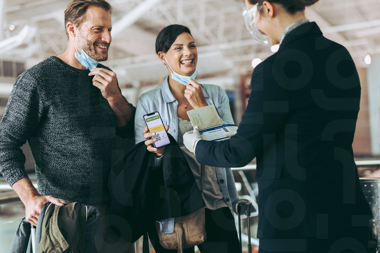 Man and woman getting checked at boarding gate by airport staff in pandemic. Airport staff checking couple with face masks pulled down.