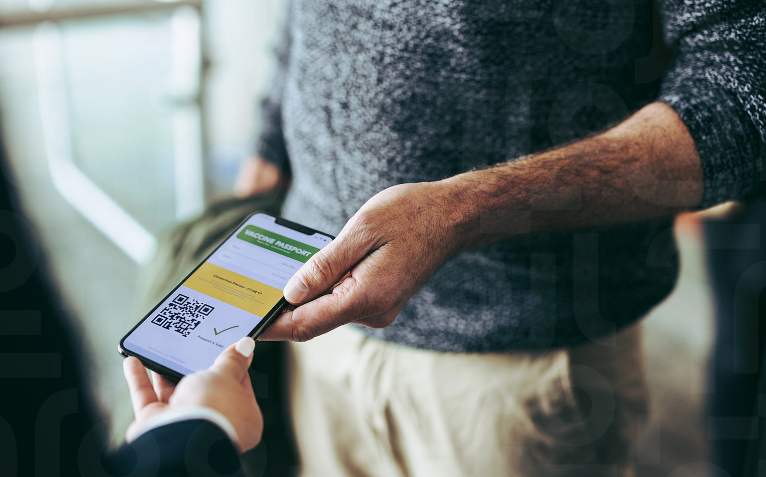 Tourist showing his health passport on mobile phone to flight attendant. Male passenger at airport check-in counter showing his covid-19 immunization certificate to the airline attendant.