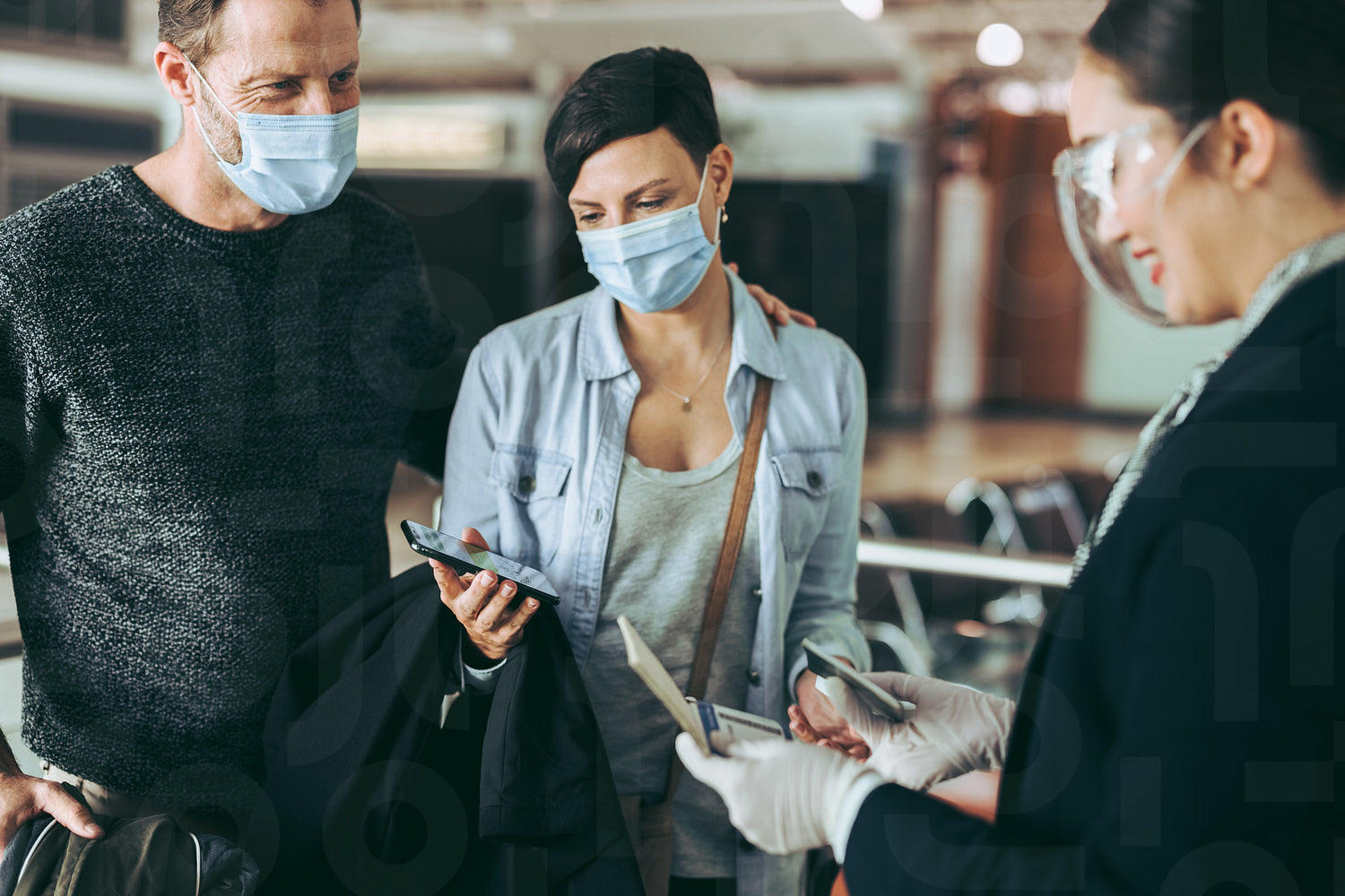 Tourist couple in face masks at check-in counter with airport staff. Airlines attendant checking passport and boarding pass of a passenger couple.
