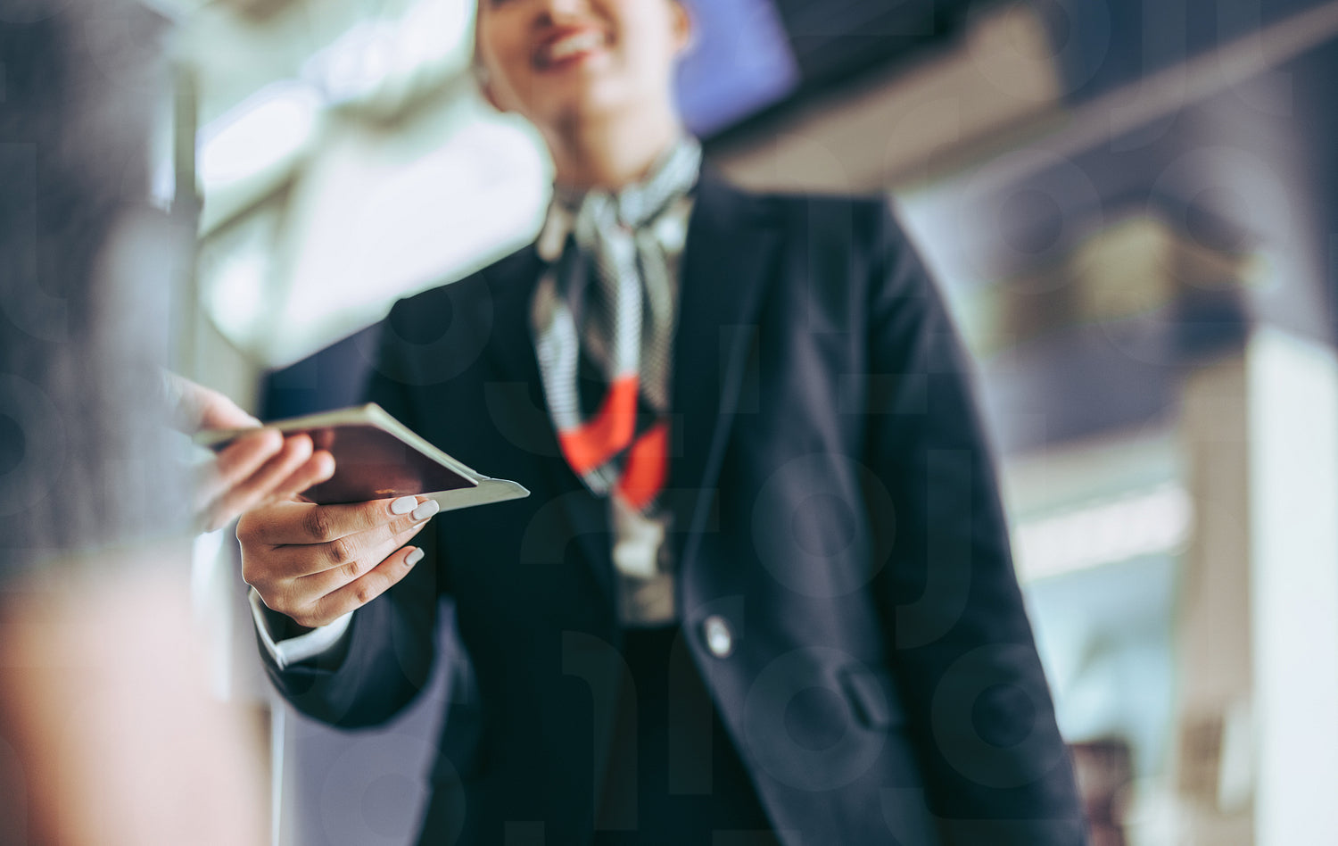 Cropped shot of flight attendant checking passport at airport. Ground attendant at departure gate checking passport of passenger.