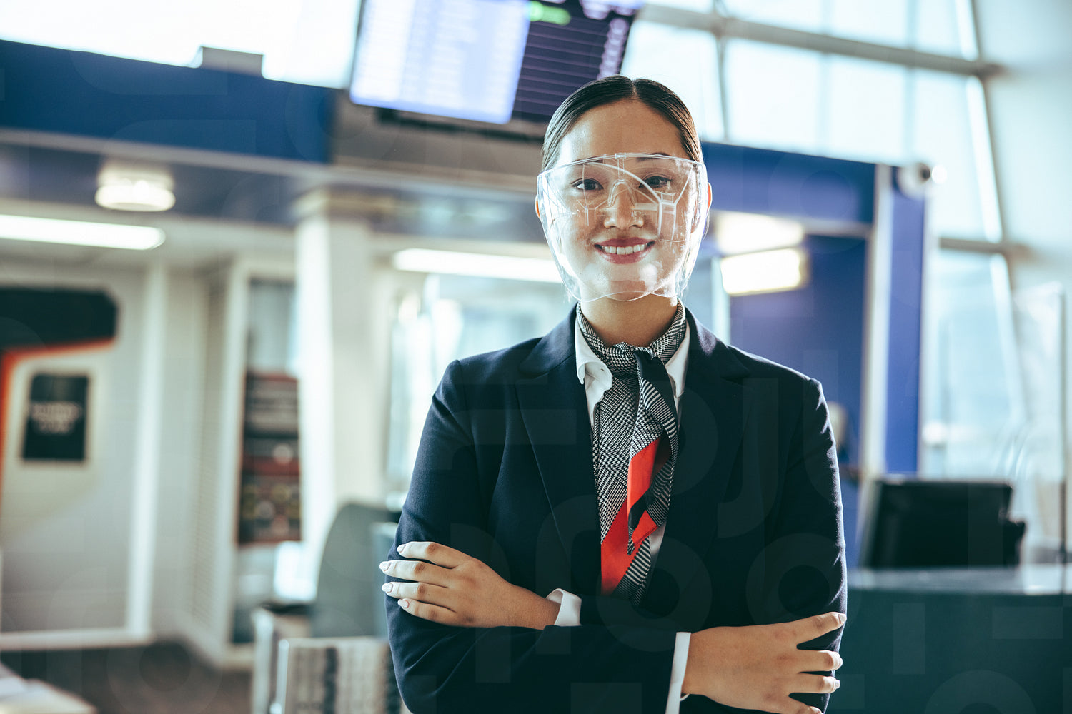Portrait of a female ground attendant working during pandemic. Woman wearing face shield standing with her arm crossed at airport terminal.