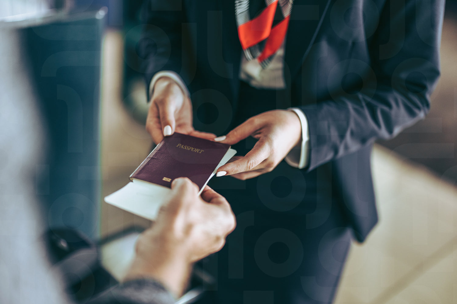 Closeup of flight attendant taking passport of tourist at airport check-in counter. Airport staff checking passport of traveler at airport.