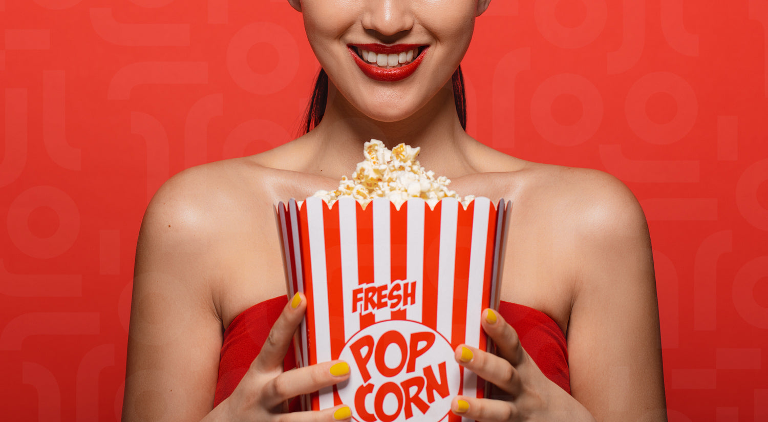 Close up of asian female holding popcorn against red background.
