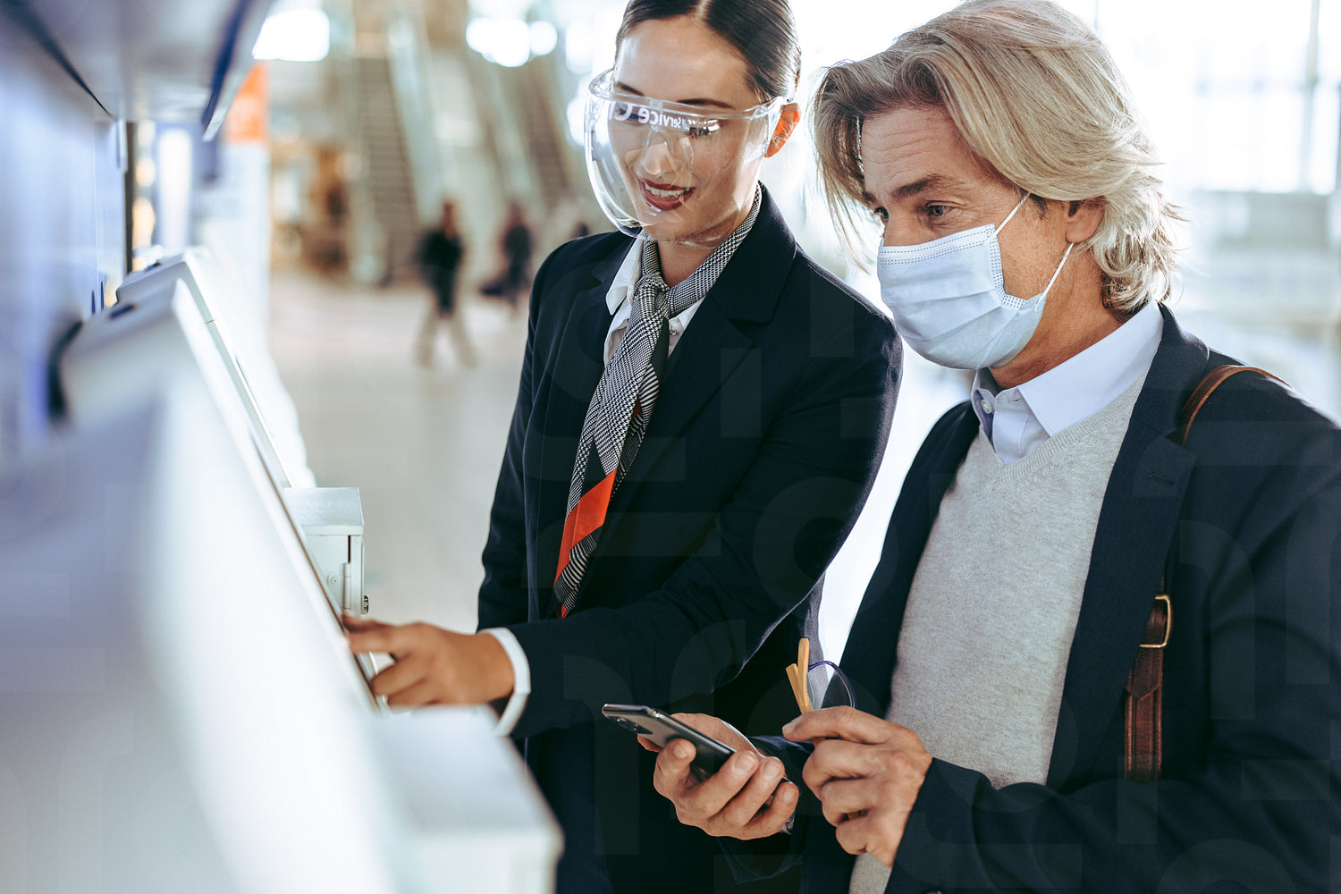 Airline staff helping a business traveler in doing the self check-in at the airport terminal during covid-19 pandemic. Masked businessman at self service check in machine with flight attendant.