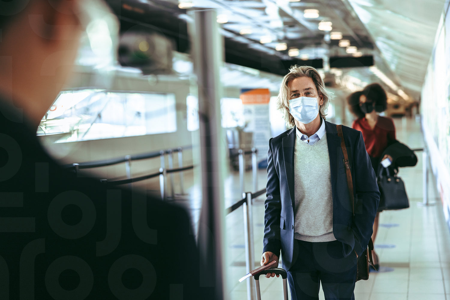 People traveling by airplane during covid-19 wearing face masks, waiting in line at airport terminal at thermal scanning checkpoint, keeping distance.