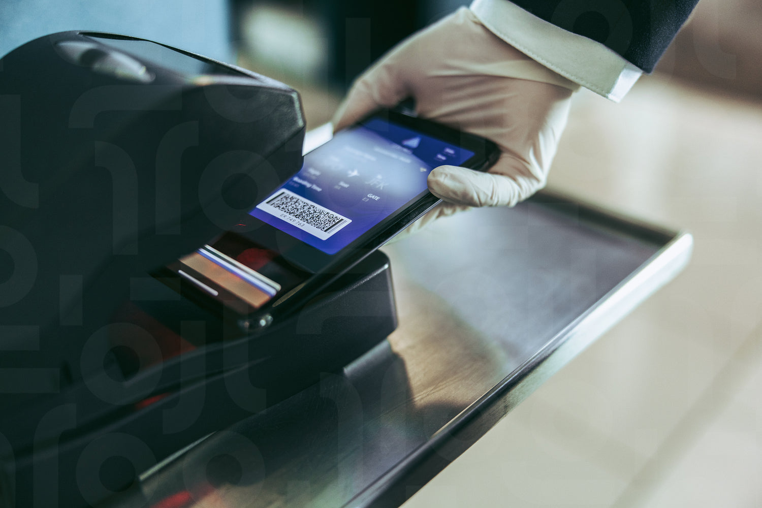 Scanning of boarding pass on mobile phone at airport counter. Cropped shot of airport staff hand scanning boarding pass on machine.
