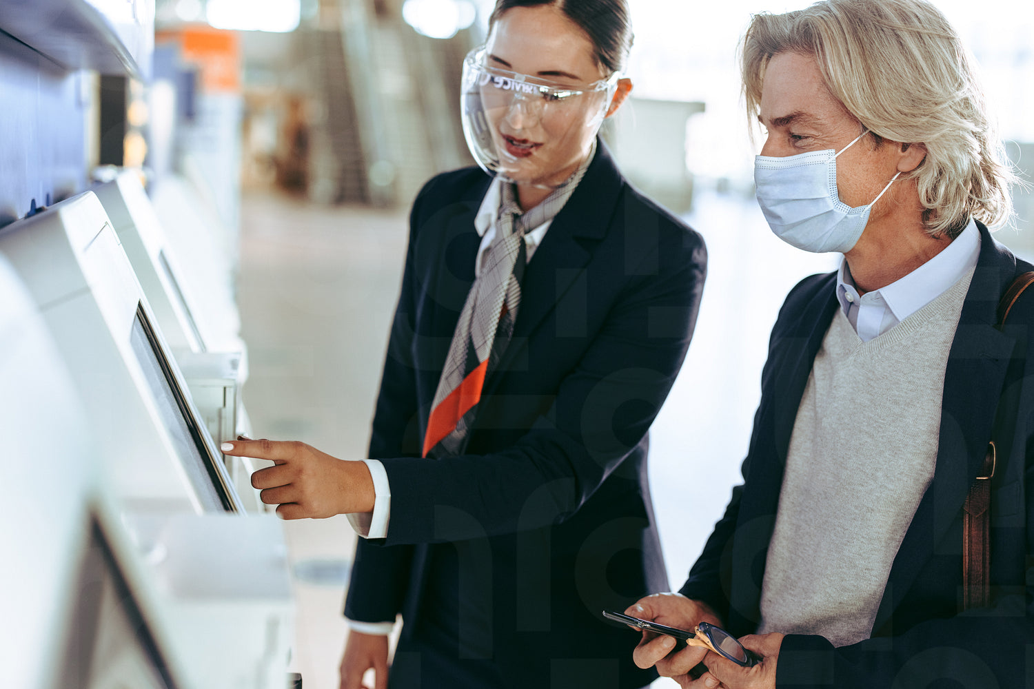 Woman ground attendant wearing face shield helping businessman in face mask with self check-in machine at the airport terminal during pandemic.