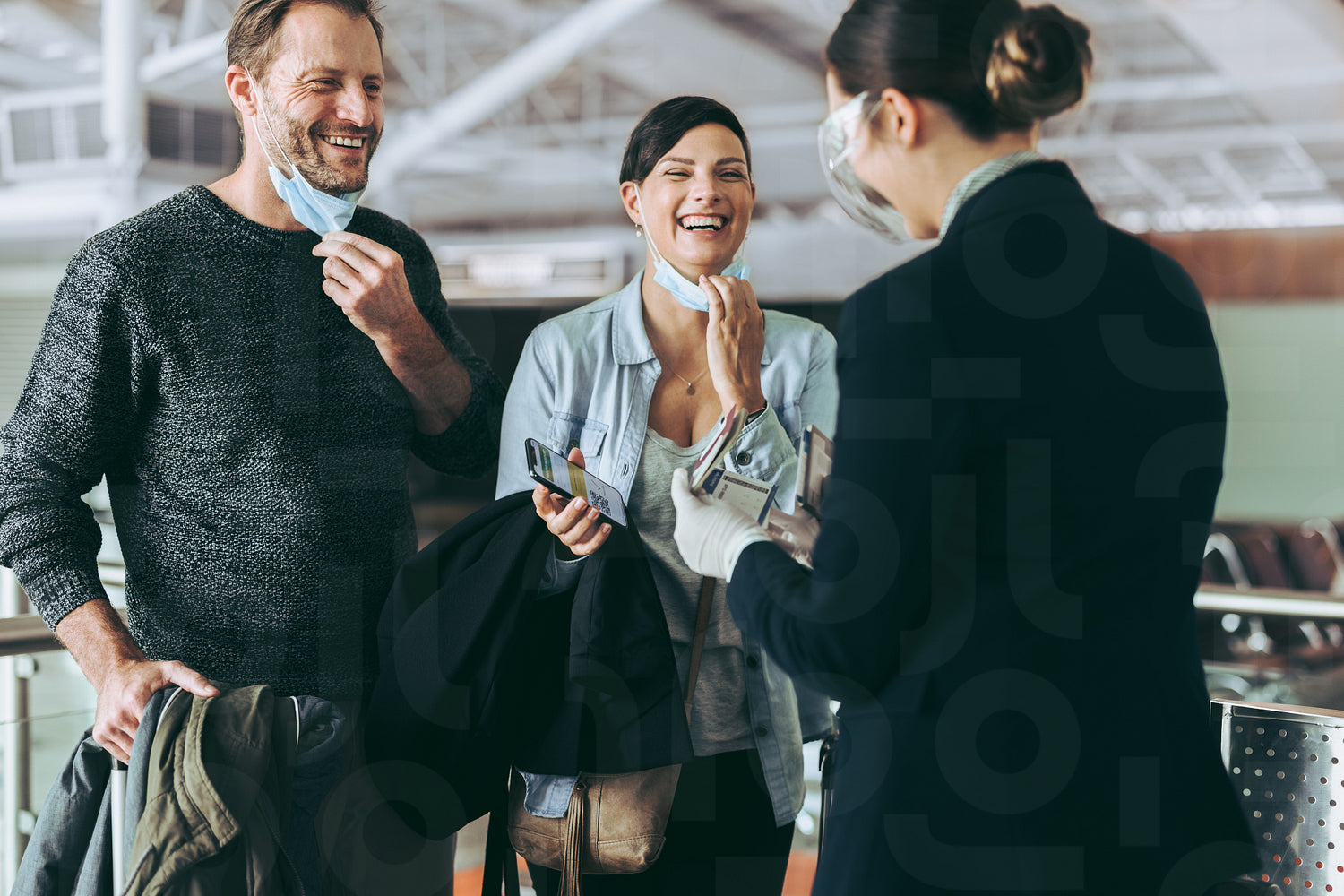 Man and woman at check-in counter with airport staff in pandemic. Airline attendant looking at boarding pass of couple at departure gate.