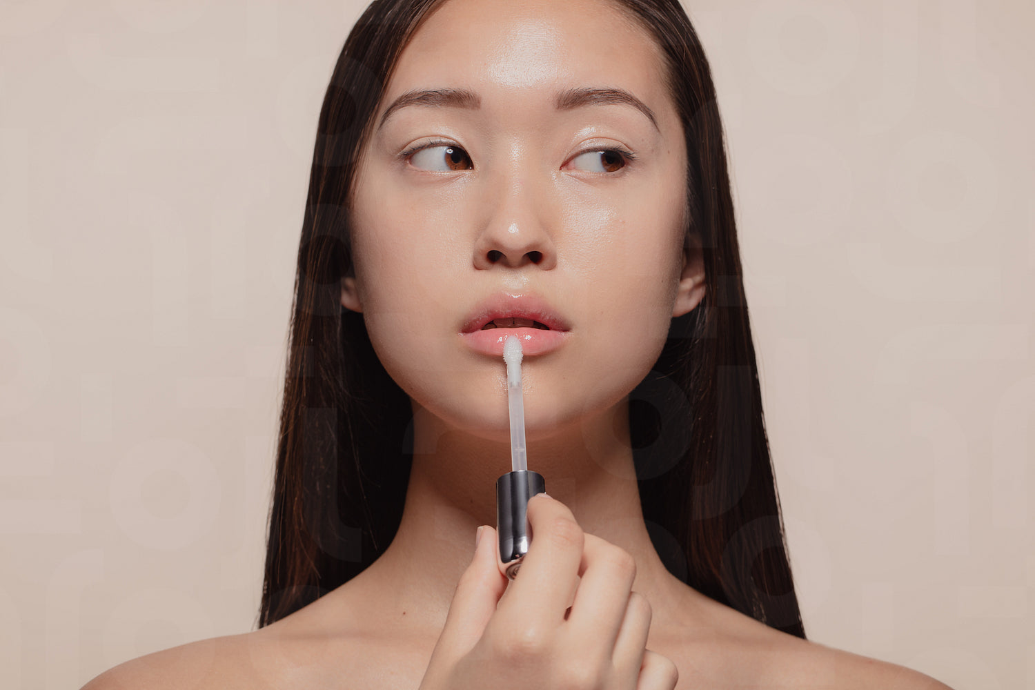 Portrait of beautiful young woman applying transparent lip gloss with applicator. Asian female model looking away while doing make up against beige background.