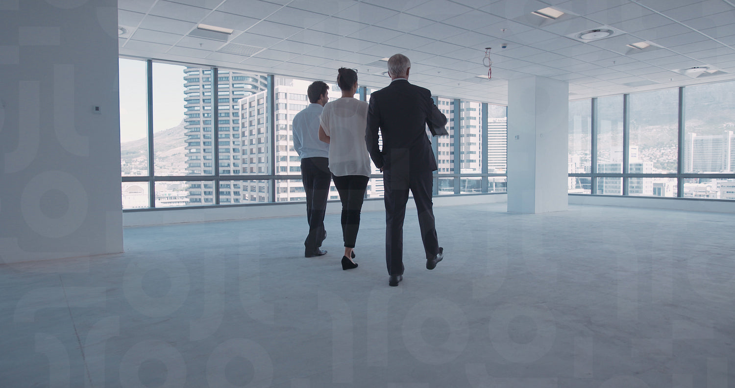 Businesspeople meeting architect at office site and discussing interior plan. Owners discussing new interior in unfurnished empty office space.