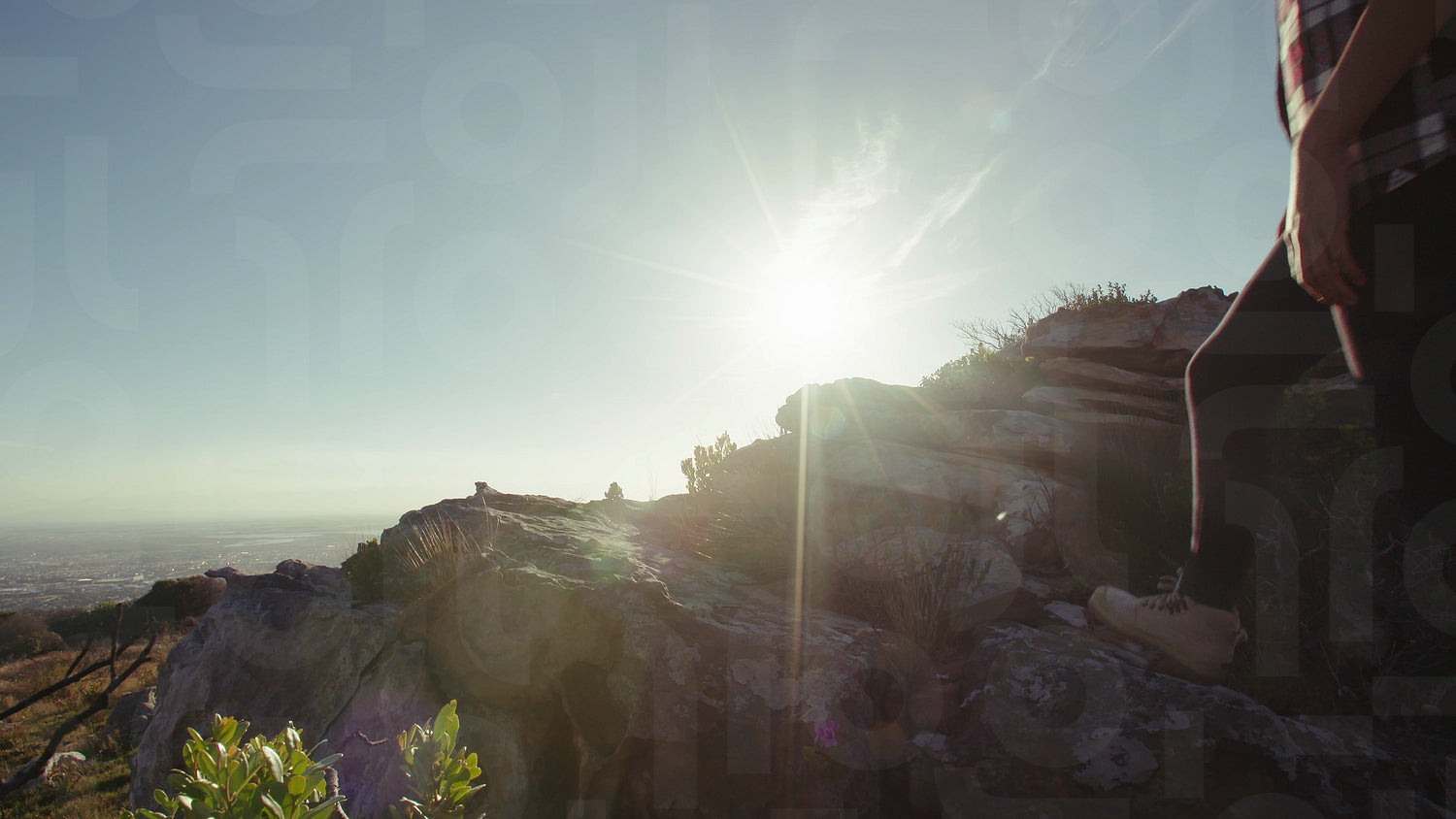 Friends on a mountain hike on sunny day. Men and women walking through rocks on mountain trail.