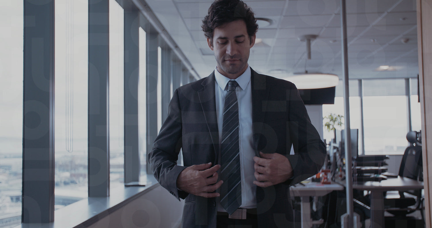 Confident young businessman buttoning jacket in office. Stylish male executive buttoning suit.