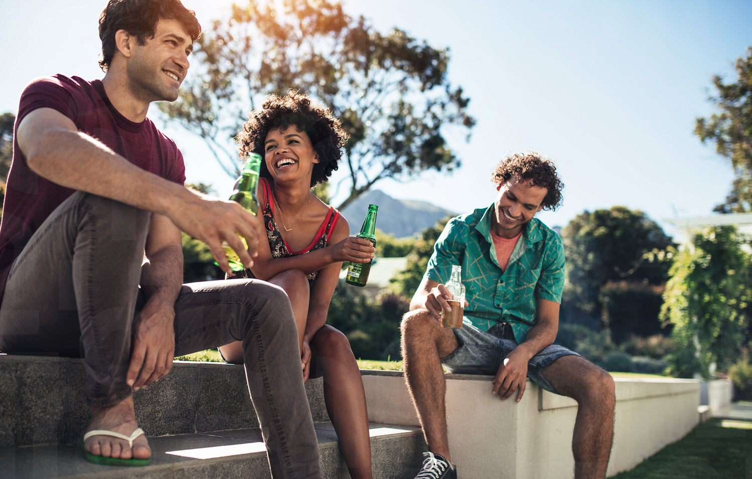 Group of young friends having a party in backyard garden. Men and women drinking beers outdoors.