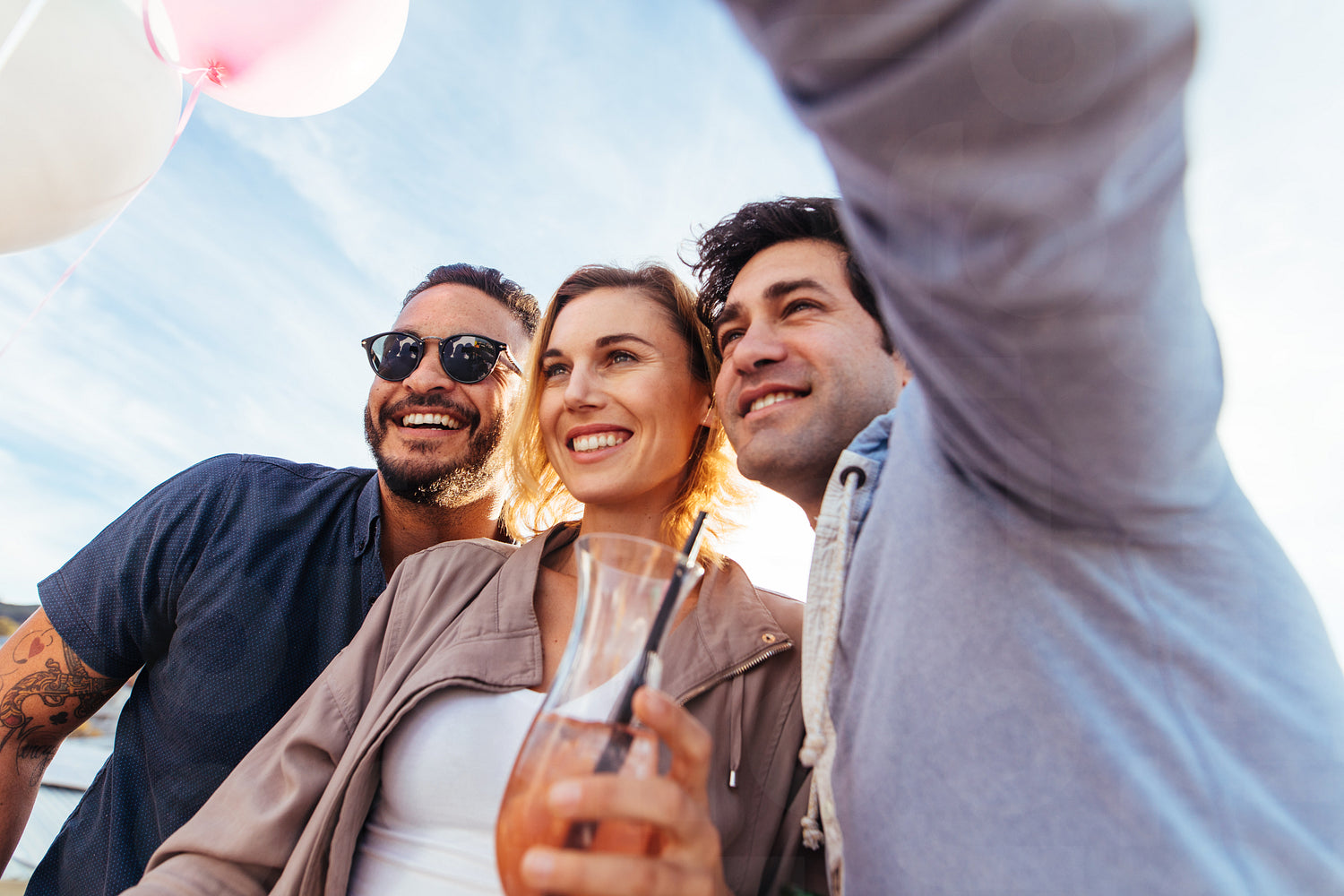Young people partying together and taking selfie. Group of men and woman on rooftop party taking selfie.