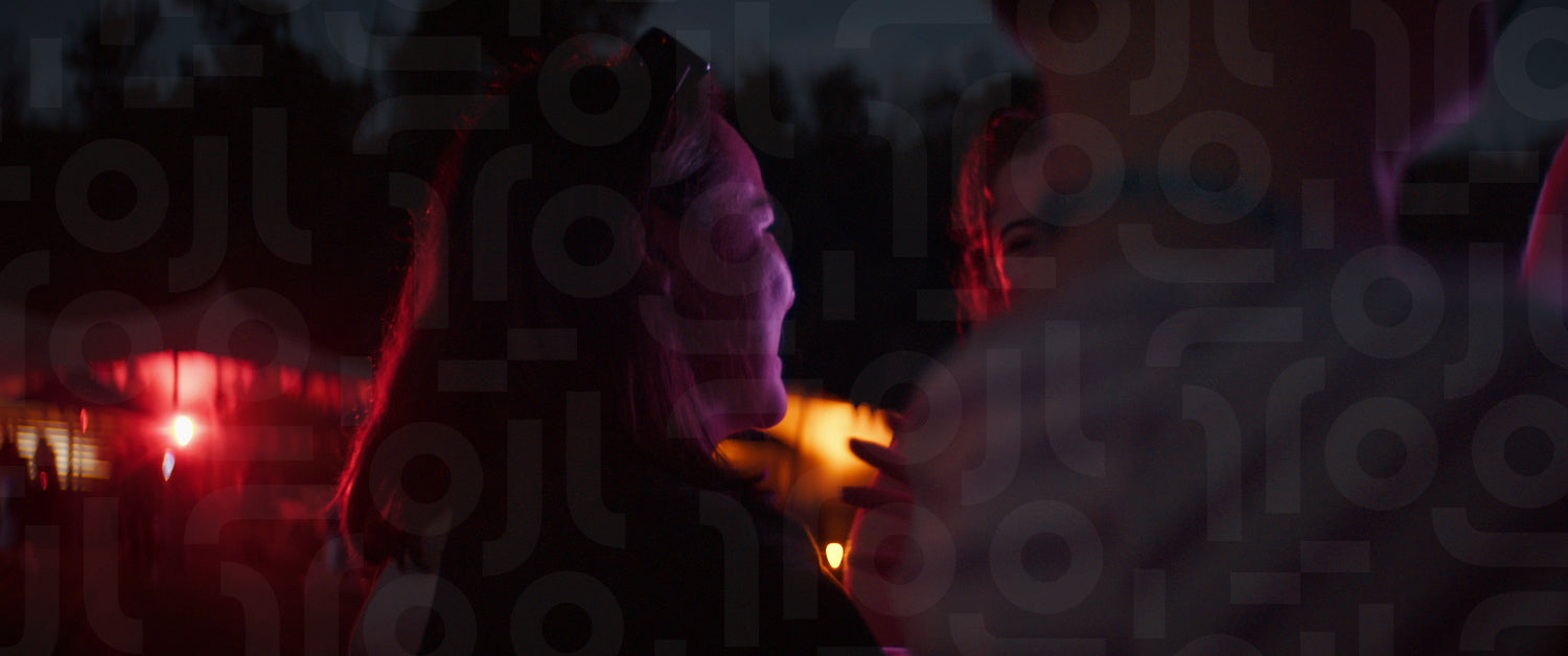 Young female friends smiling, having fun and enjoying the festival nightlife. Captured using an anamorphic lens and presented in the 2.39:1 CinemaScope aspect ratio.