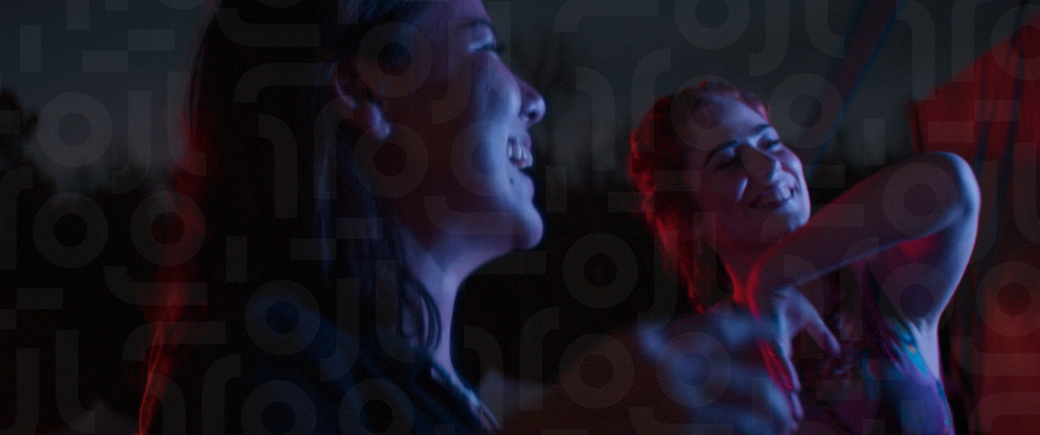 Young friends are having fun, dancing, and enjoying the vibrant festival atmosphere. Captured using an anamorphic lens and presented in the 2.39:1 CinemaScope aspect ratio.