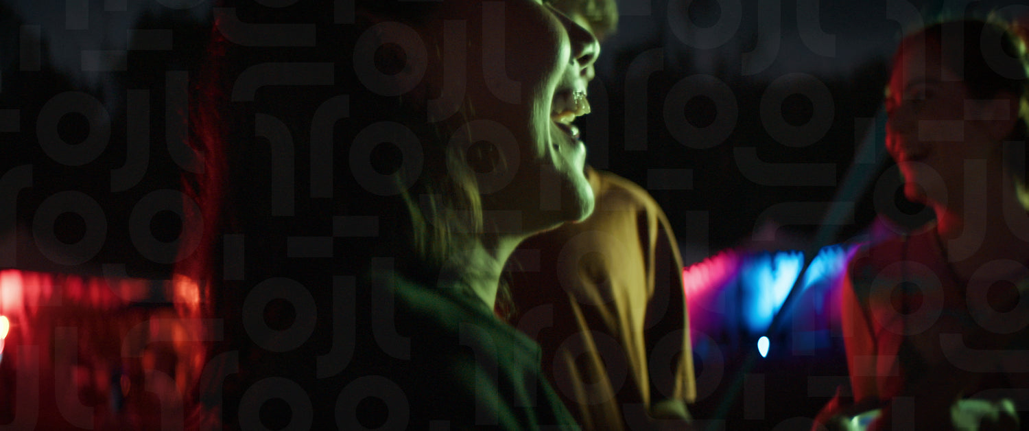 A young woman dances and laughs with her friends at a music festival at night. Captured using an anamorphic lens and presented in the 2.39:1 CinemaScope aspect ratio.