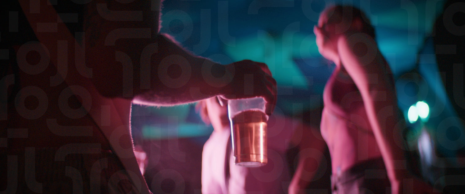 Friends having fun dancing and drinking at a music festival. Captured using an anamorphic lens and presented in the 2.39:1 CinemaScope aspect ratio.
