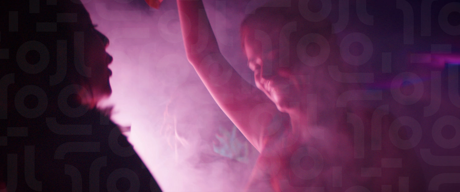 Two girlfriends enjoy the music and dance together in the smoke and lights at a festival. Captured using an anamorphic lens and presented in the 2.39:1 CinemaScope aspect ratio.