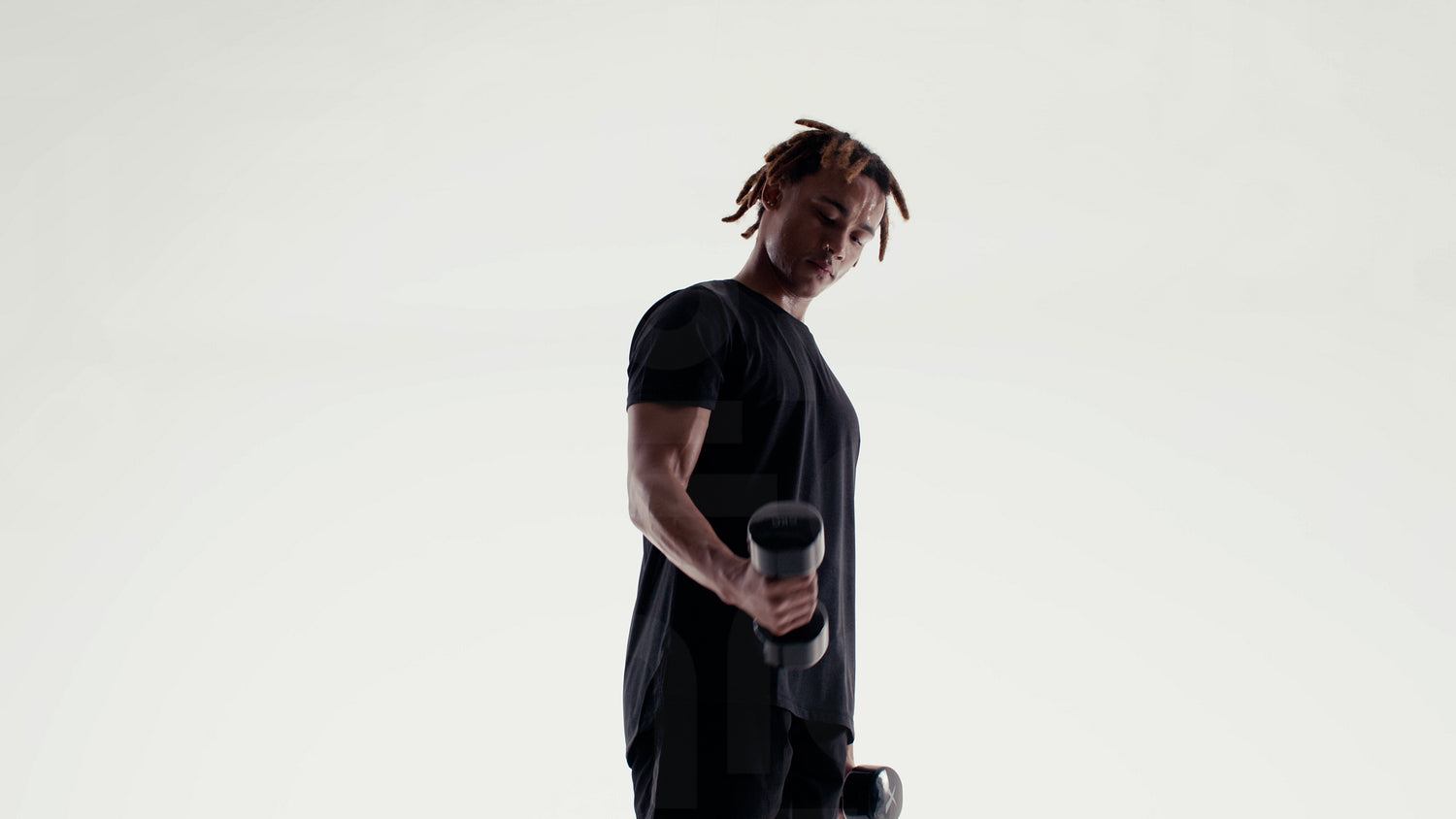 A focused man exercises with dumbbells building strength and muscle in a bright studio