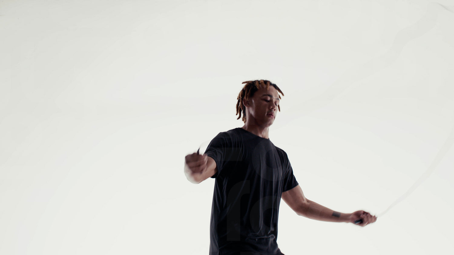 A focused athlete with dreadlocks is vigorously skipping rope, demonstrating a powerful and effective full-body workout in a bright, clean studio.