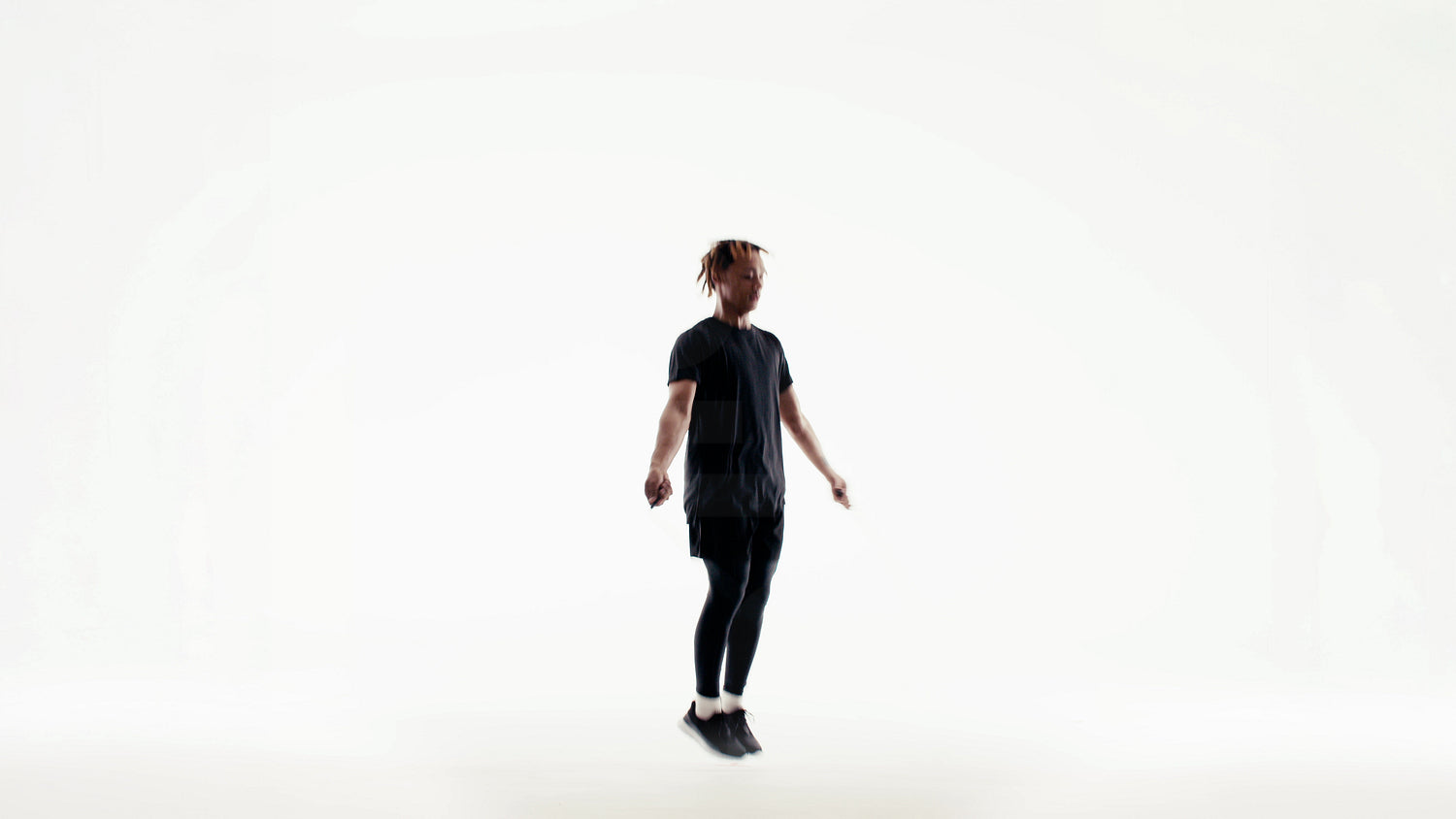 Dynamic shot of a focused man performing a high-energy jump rope workout in a bright, minimalist studio. Ideal for themes of fitness, health, and athletic training.