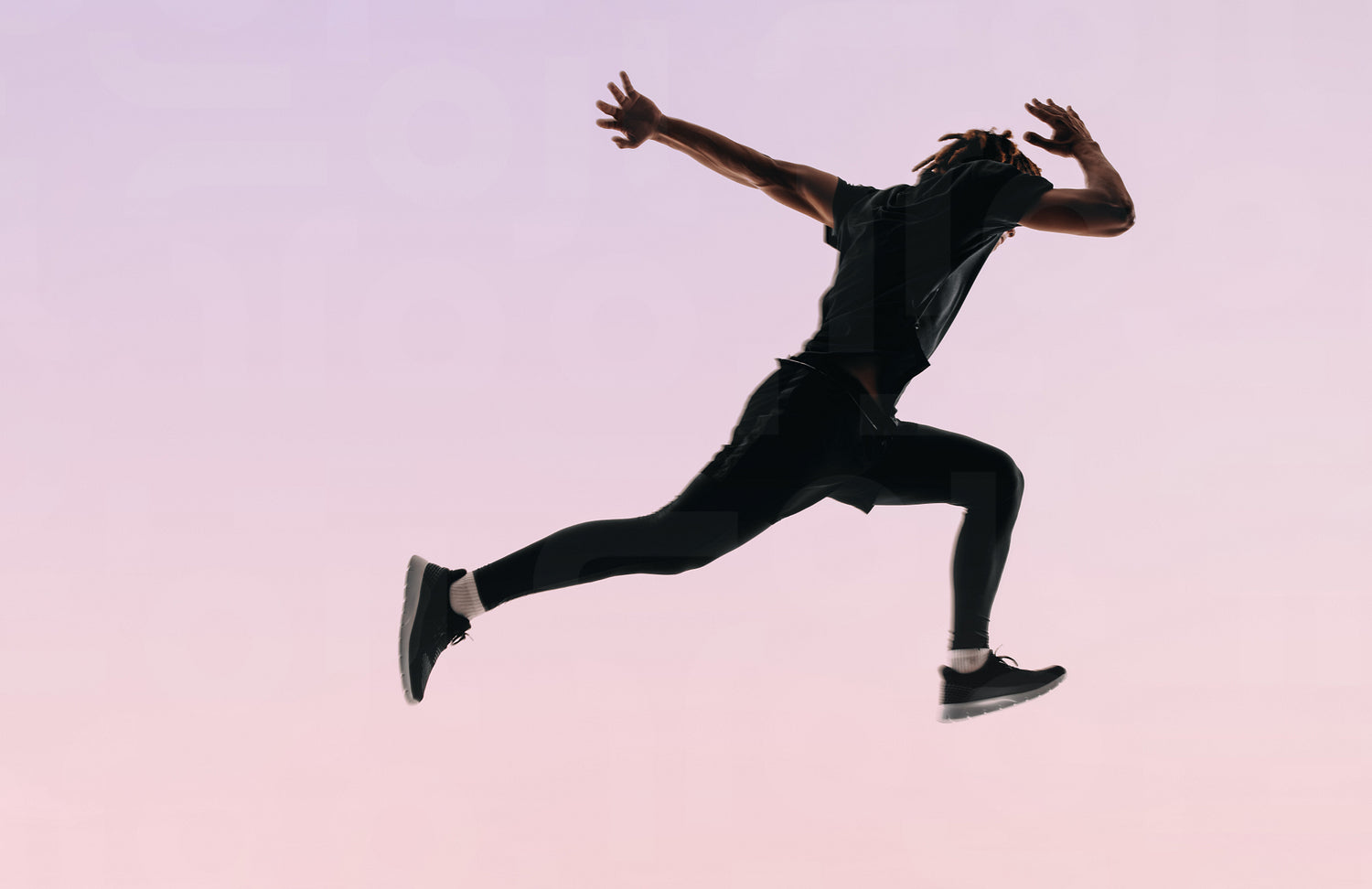 Silhouette of male athlete in pink sportswear mid-air during sports training