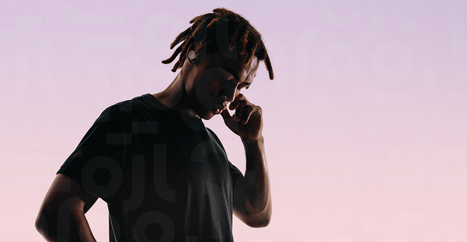 Man with dreadlocks stands in a studio against a pink background, eyes closed in tranquility. He listens to music through wireless earbuds, immersed in a playlist. Silhouette highlighting a focus on music.
