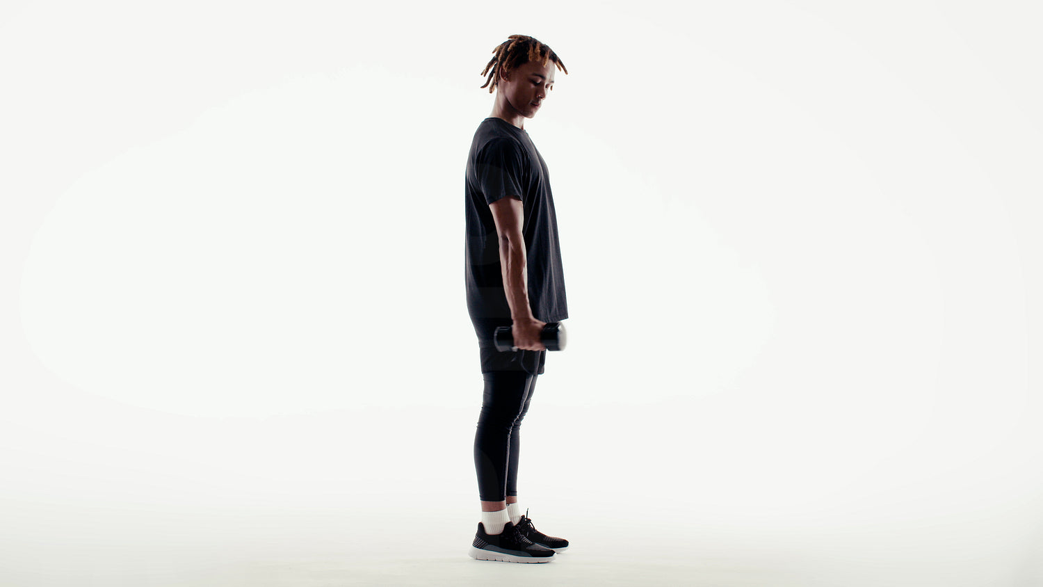 Young man with dreadlocks performs bicep curls with dumbbells. This intense workout in a studio silhouette emphasizes strength, fitness, and a healthy lifestyle.