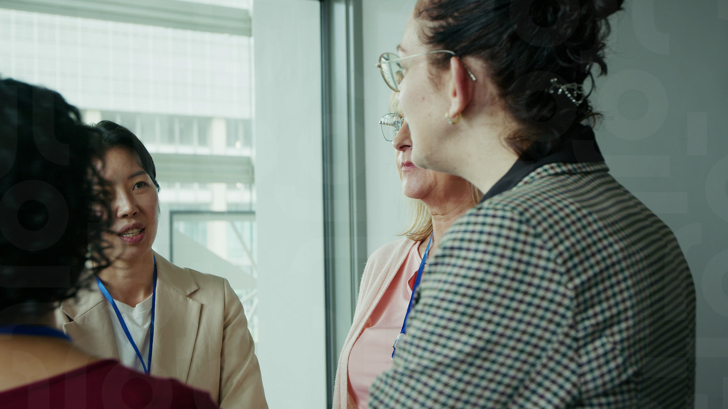 Diverse women professionals engage in a focused business discussion indoors. They actively listen and exchange ideas, fostering an atmosphere of collaboration, teamwork, and productivity.