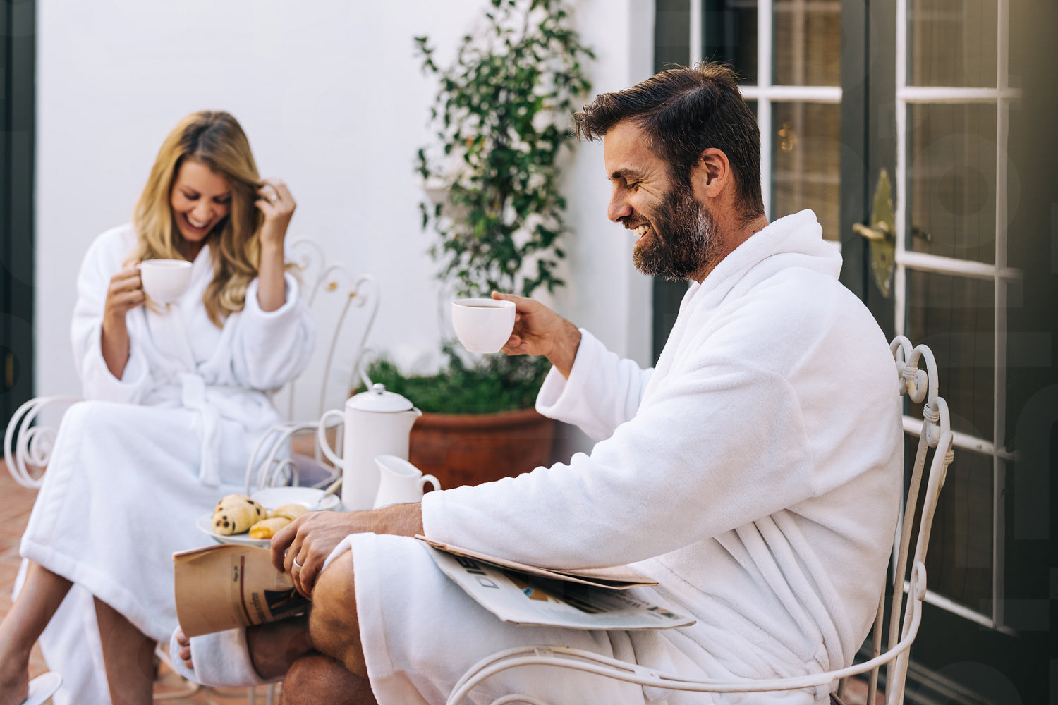 Cheerful married couple having tea in morning robes. Middle aged couple smiling while sitting together outside a holiday resort. Couple enjoying a weekend getaway at a luxury resort.