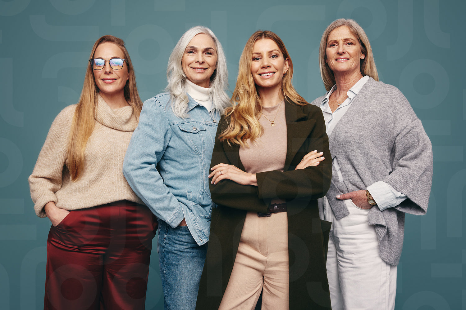 Smiling mature women standing together in a studio. Group of four mature women smiling at the camera confidently while standing against a studio background. Independent women embracing empowerment.