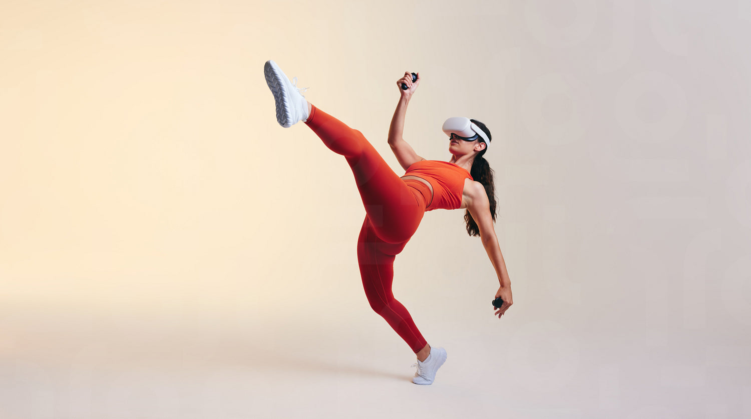 Sporty young woman working out using 3D technology. Athletic young woman exploring a virtual reality fitness game. Energetic young woman wearing virtual reality glasses in a studio.