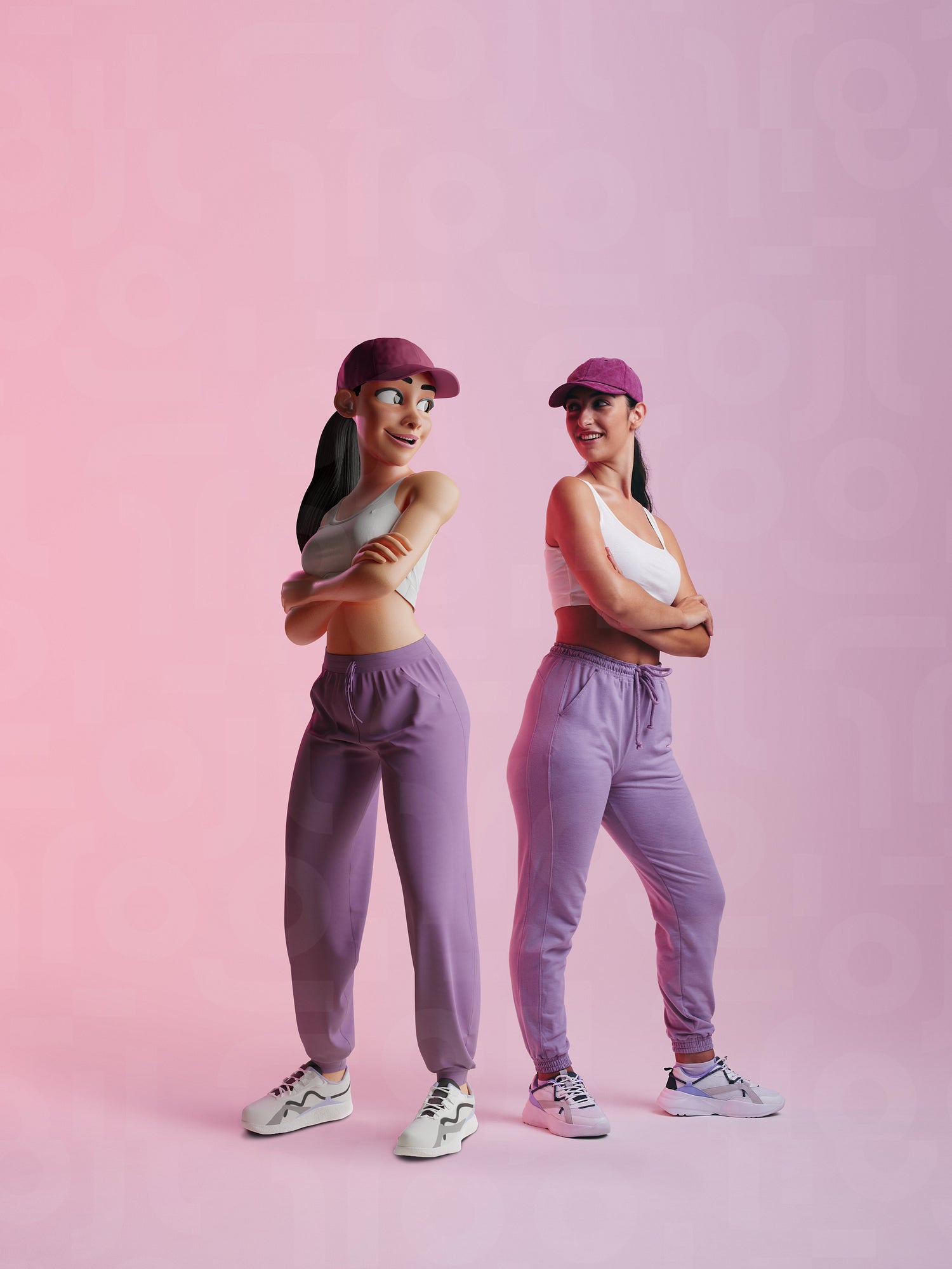 Sporty young woman standing next to her metaverse avatar in a studio. Happy young woman smiling at the 3D simulation of herself. Cheerful young woman exploring virtual reality.