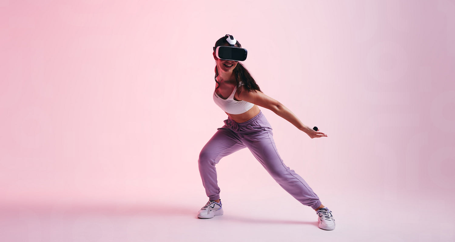 Happy woman having fun in the metaverse. Active young woman gaming with virtual reality goggles and controllers. Energetic young woman enjoying a 3D experience in a studio.