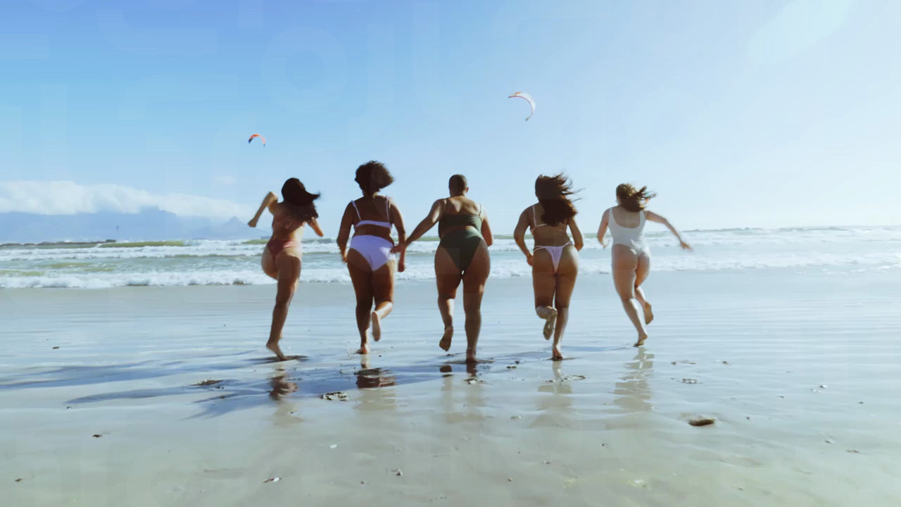 Group of different size women in bikinis running in to sea water together. Multi-ethnic women in swimwear enjoying themselves at the beach.