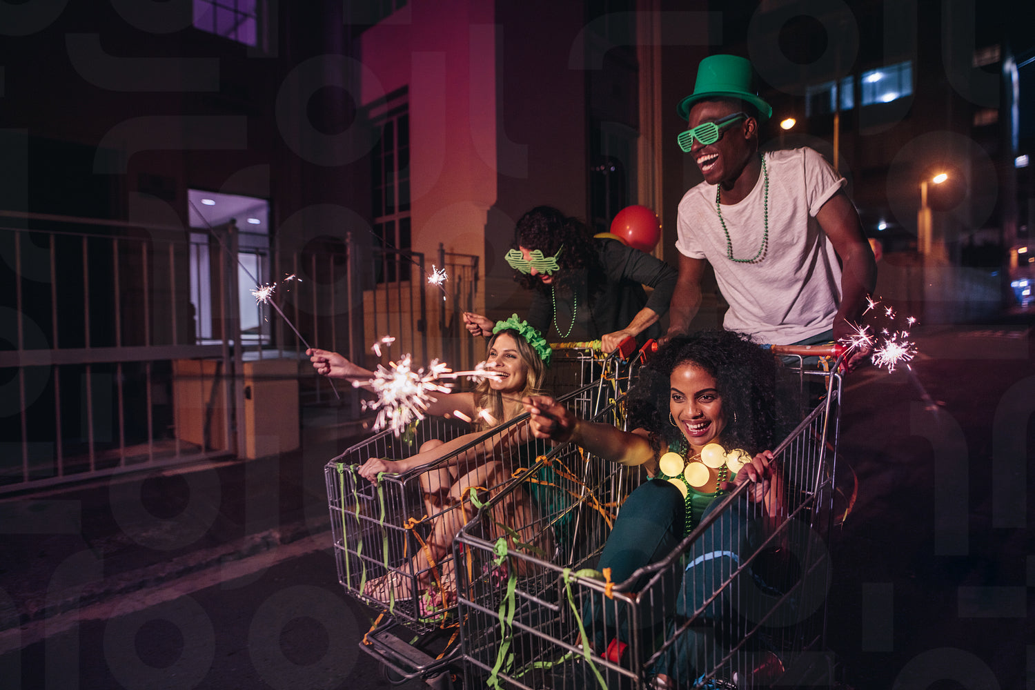 Men pushing women in shopping trolleys and having fun with fireworks. St.Patrick's day celebration on city street at night with sparklers.