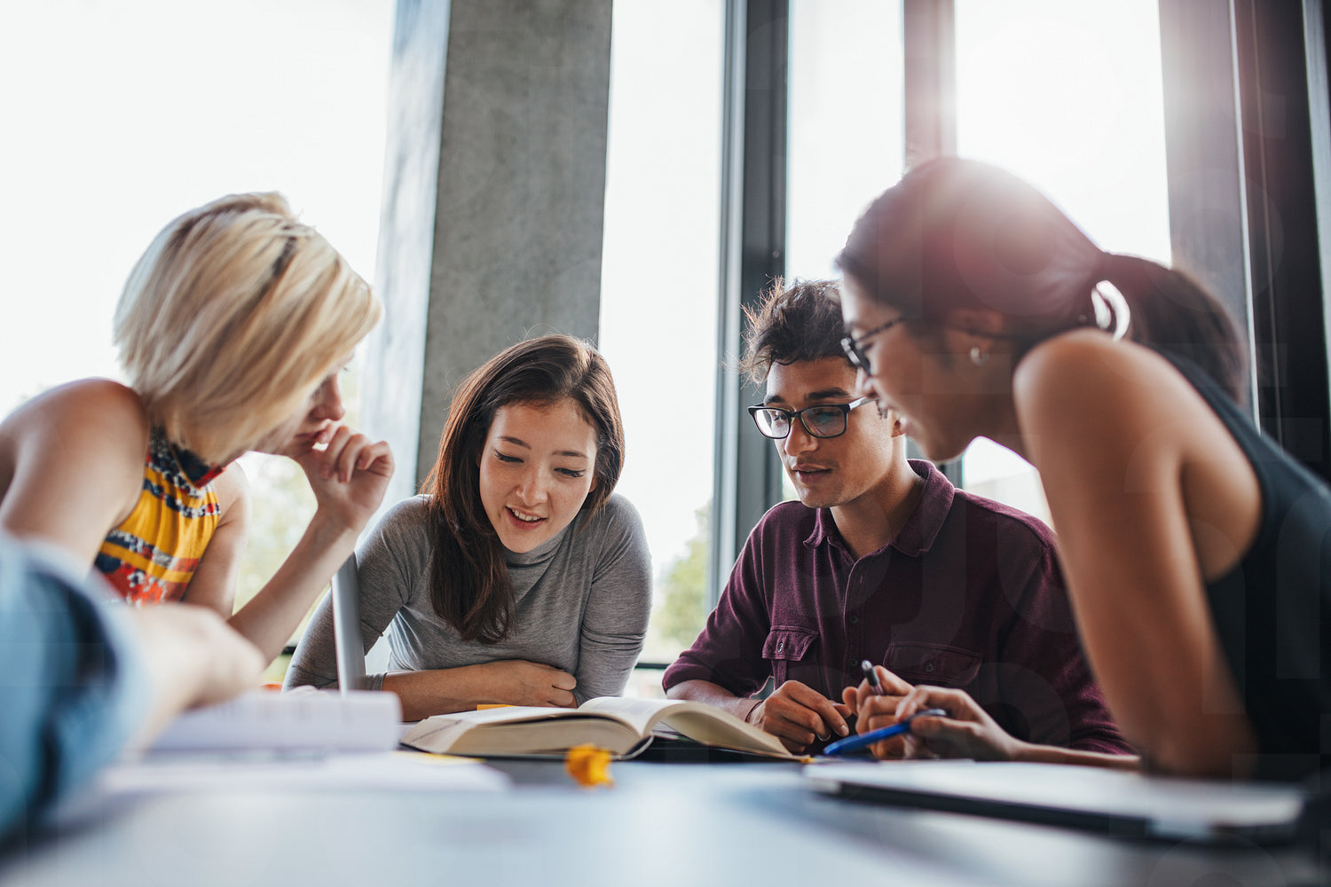 University students in cooperation with their assignment at library. Group of young people sitting at table reading books.