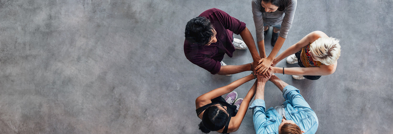 Top view of young people with hands on top of each other. Young students making a stack of hands.