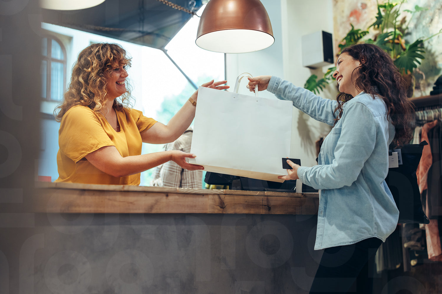 Clothing store cashier handing over the purchases to female customer. Woman buying clothes in a fashion store.