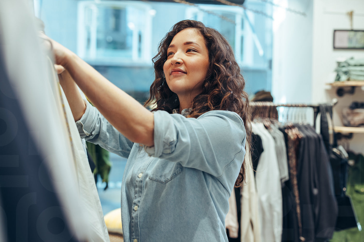 Female shopper in clothing store. Woman choosing clothes hanging on rack in fashion store.