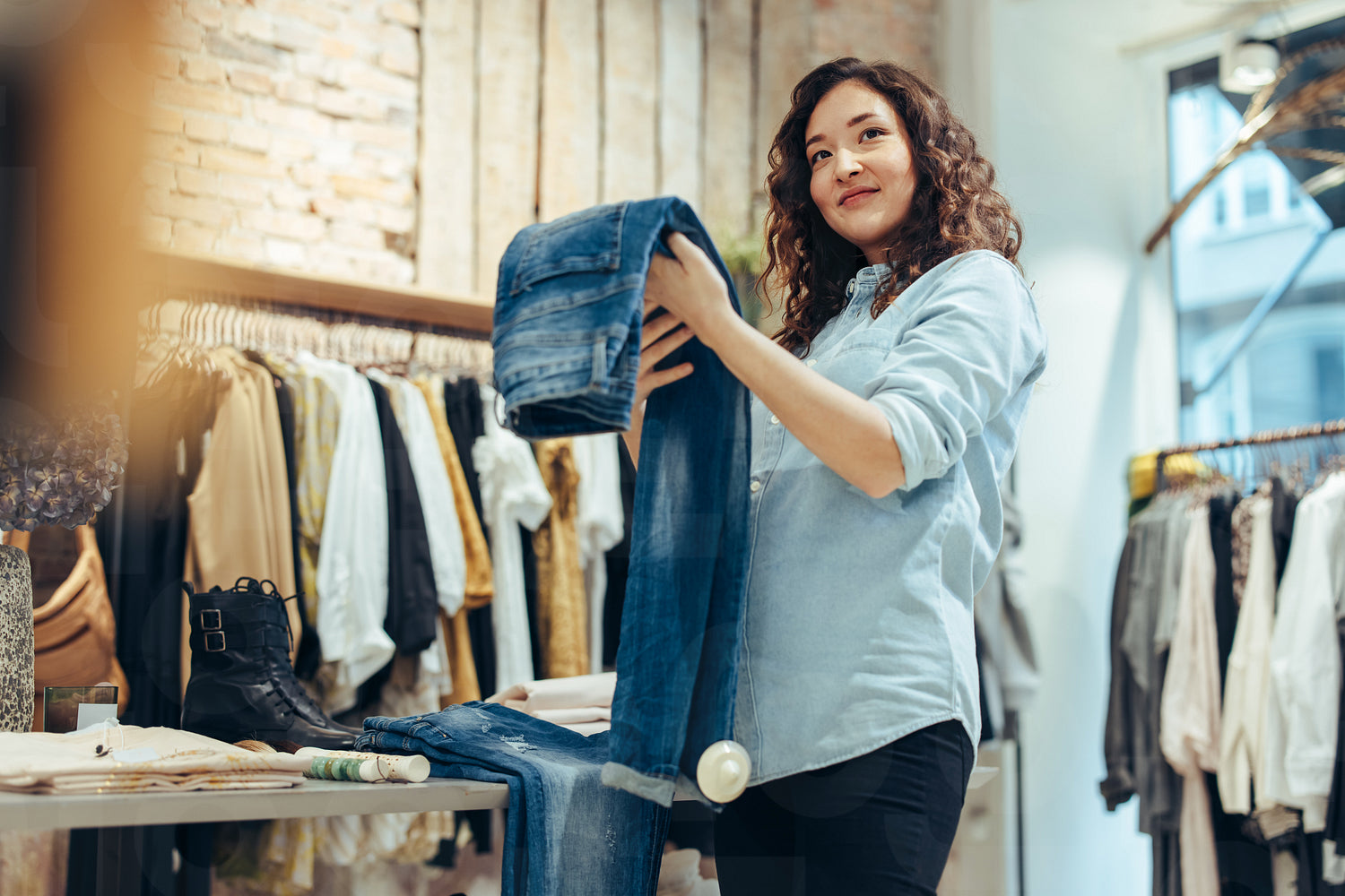 Woman holding jeans and looking away while shopping in store. Female shopping in clothing store.