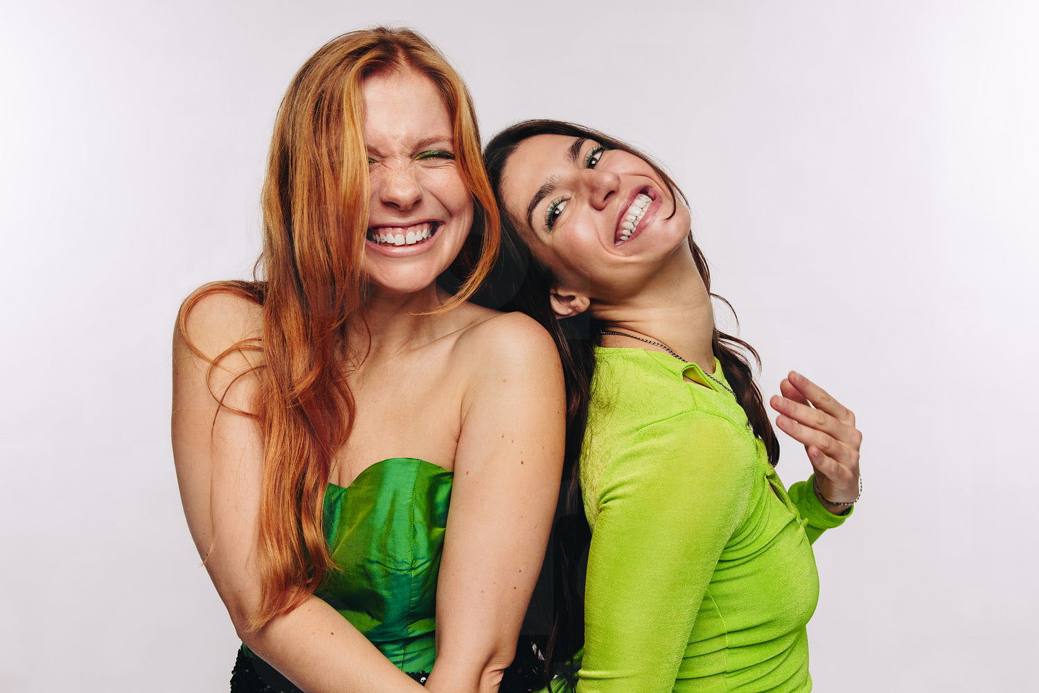 Two young women laugh and lean back to back in a studio portrait, sharing a candid joyful moment. Their wide smiles and relaxed poses convey friendship, fun, warmth and carefree energy.