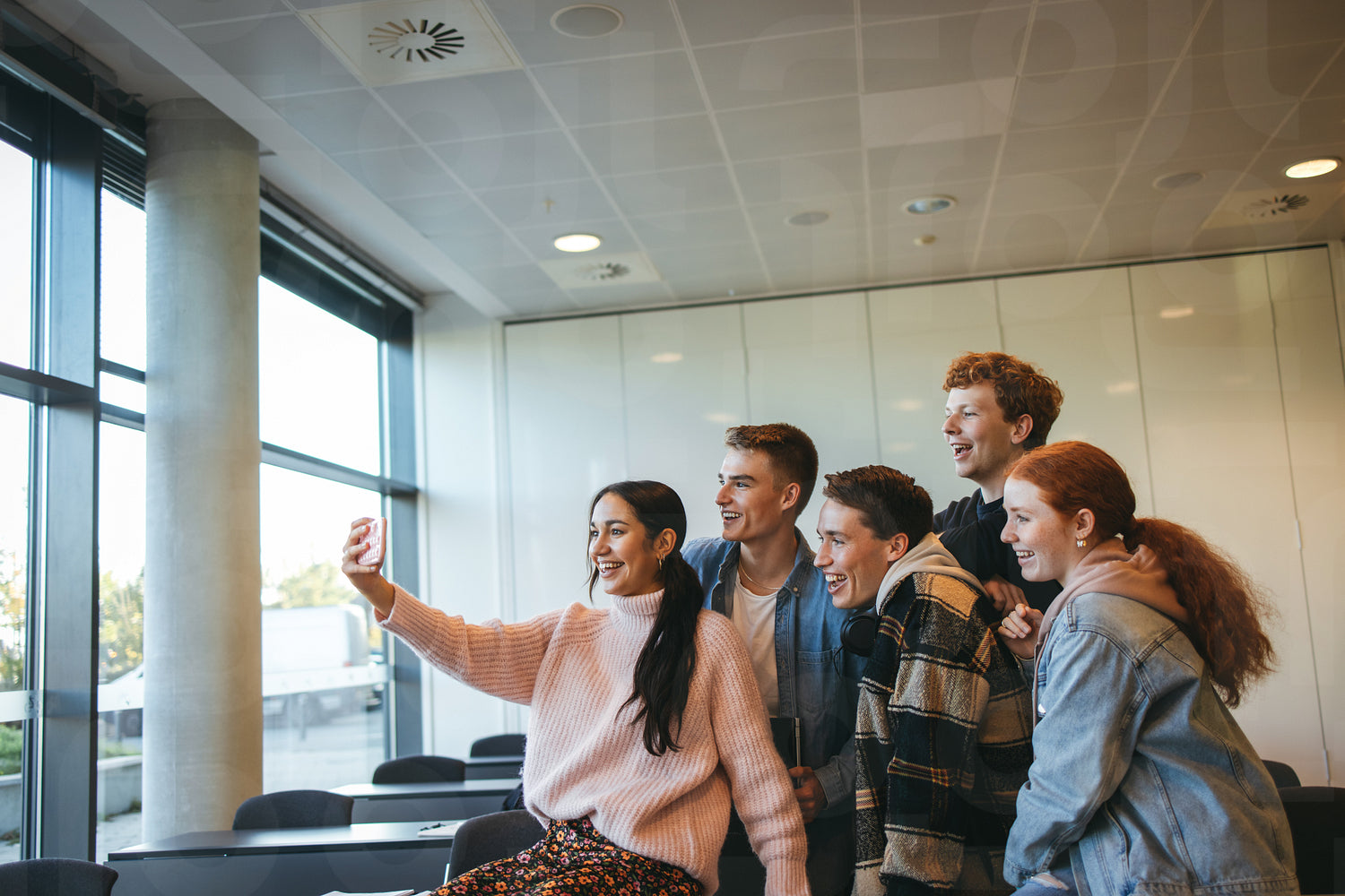 Friends in a classroom taking group selfie