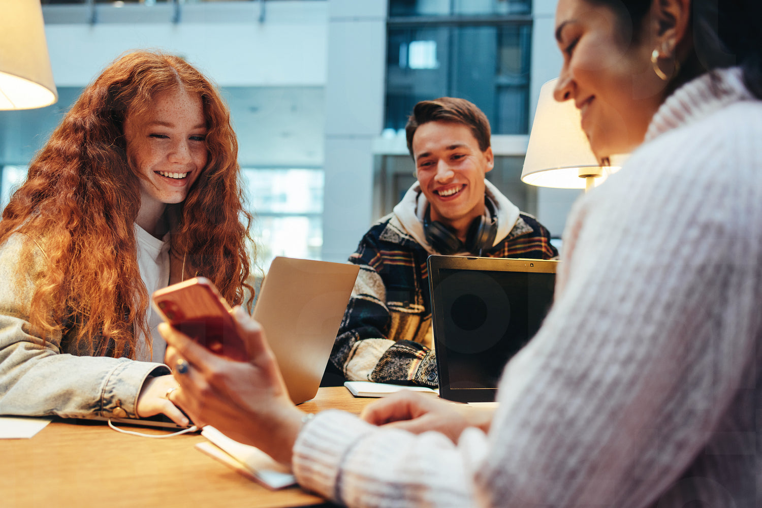 Girl showing her phone to her friends while studying together in library. Group of friends looking at phone and smiling while doing studies in library.