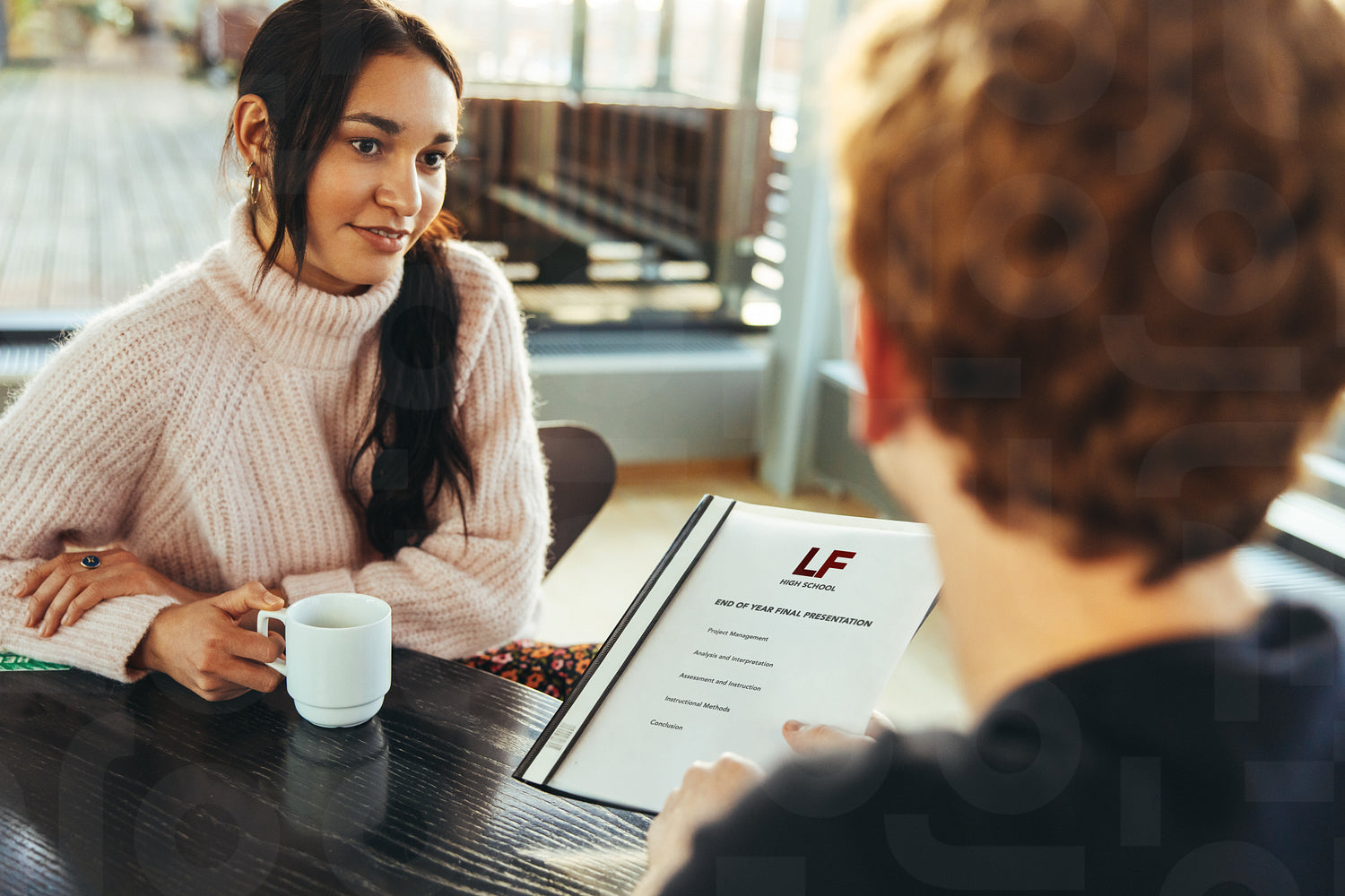 Student showing final presentation file to girl in college. Girl holding coffee and listening to classmate in university.