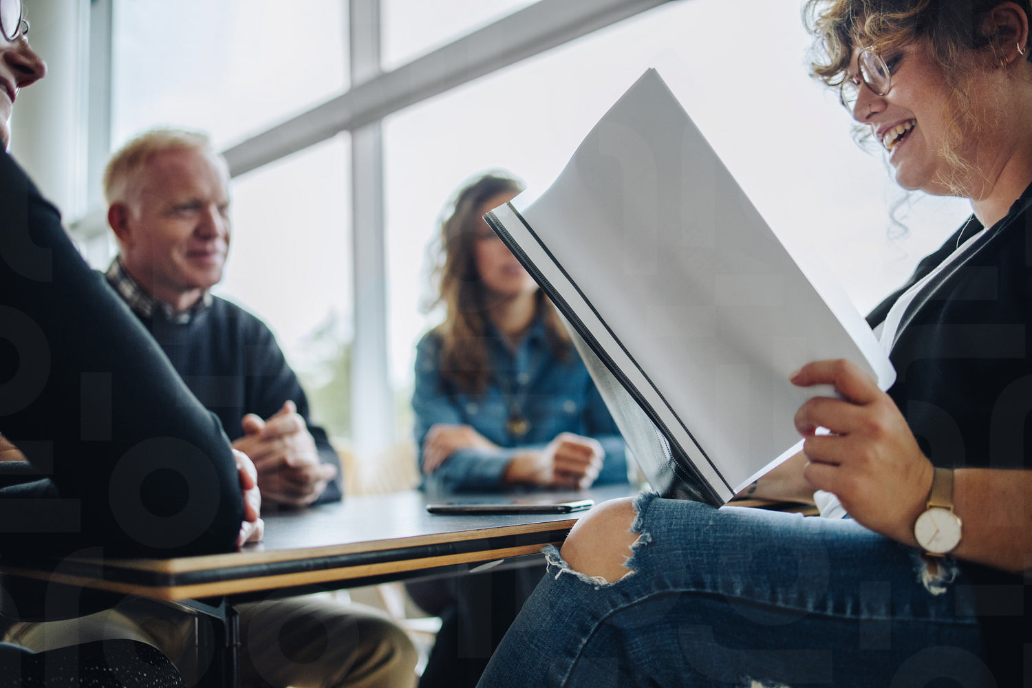 Smiling business woman reading a paper with her colleagues sitting by in meeting room. Female professional reading agreement document during boardroom meeting.