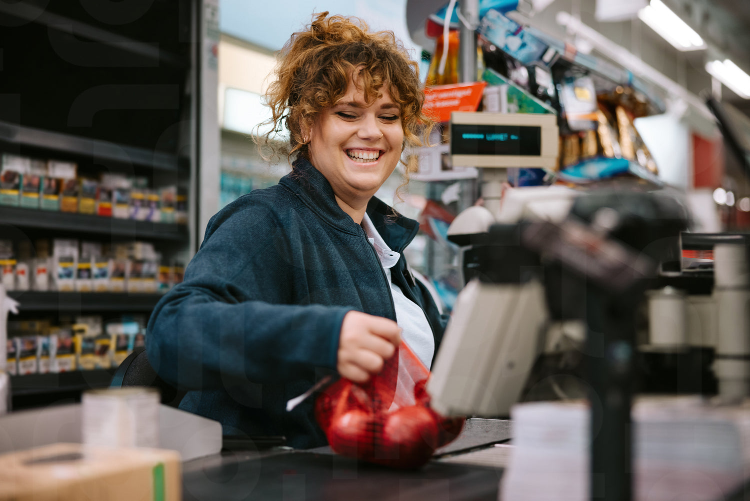 Female cashier passing the products through the bar code reader at supermarket checkout. Woman working at grocery store cash register.