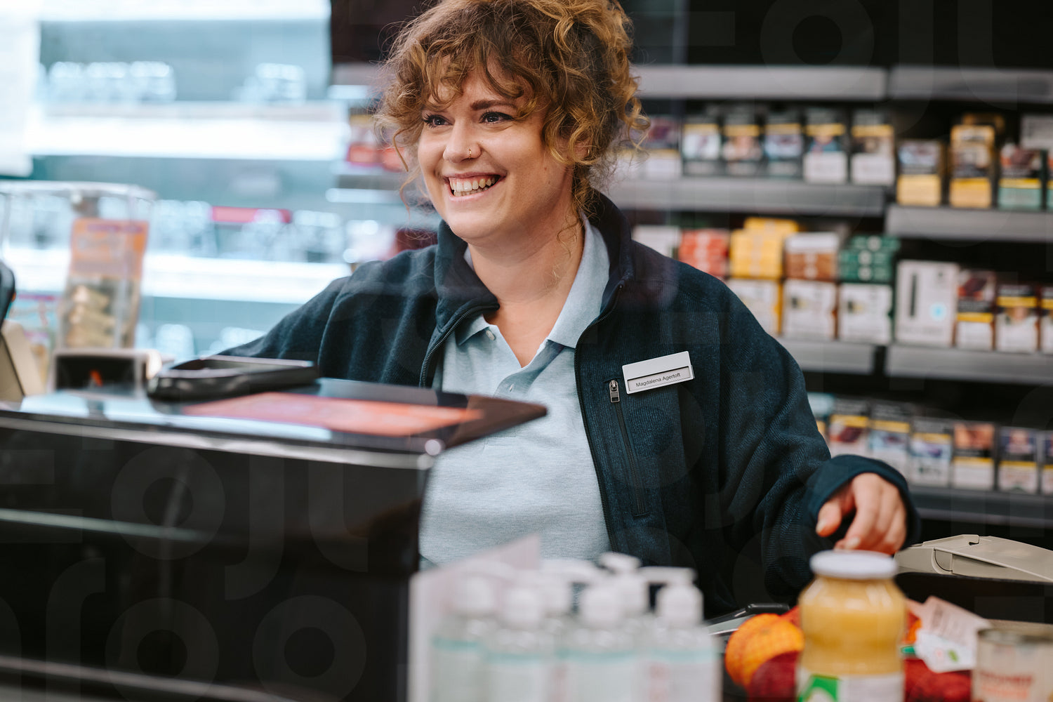 Female grocery store manager working at checkout counter. Woman cashier working at supermarket checkout.