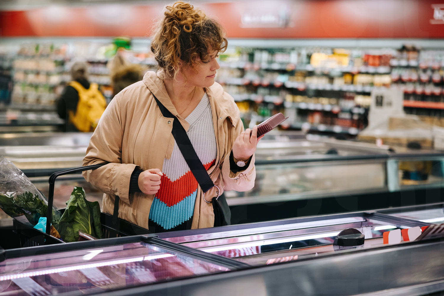 Woman at grocery store reading food labels. Female customer reading product information at supermarket.